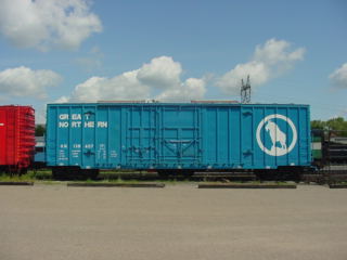 Great Northern box car 138407 built by Pacific Car and Foundry in 1967 and delivered in Big Sky Blue, which was the Great Northern's last paint scheme before the Burlington Northern merger. It was introduced in the spring of 1967 by a secretly-painted train of business cars and was to be applied to all rolling stock. However, not everything was repainted by the 1970 merger date. It is said the same design firm in St. Paul designed both the GN "Big Sky Blue" and BN "Cascade Green" paint schemes.