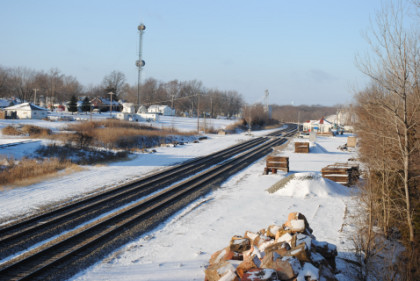 La Plata Depot Inn & Suites 12/27/2009Shelli Tucker picked me up and took me to the Depot Inn & Suites where I checked in and reeived the key to the Pullman Suite. After I stored my luggage, I took the minivan and drove out to the bridge near Riggs. Unfortunately, when I parked, the left front wheel sunk into the mud under the ice and I tried to get it out but with no luck. I called Bob Cox, the La Plata station caretaker, who was in Sedalia this morning, who then called Tom Marshall. My mobile phone seldom rings, but I received a call from Kelly Marshall, who had just sat down for lunch at the Red Rooster and said they would be out to get me out after their lunch and to enjoy the trains while I waited. It was cold and windy but I then heard a horn and knew an eastbound was on the approach.