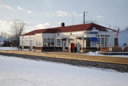 Union Pacific 9713 East passed the Chris Guenzler Million Mile Lookout Point. We returned to the Depot Inn & Suites and stored our camera gear then Bob, Elizabeth, Nathan and I drove to Kirksville and I showed them the Burlington Northern station there before we went to Ruby Tuesday Restaurant where I enjoyed a top sirloin. Back in La Plata later, Bill Compton arrived so I showed Bill, Bob and Elizabeth the Exhibition of Amtrak History and the model railroad then returned to the Victorian Suite, where I wrote today's story and uploaded it before taking a sauna bath and calling it a night.