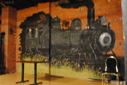 The steam engine painting on the wall behind the stage at the Event Center. We then visited Trainparty.com.