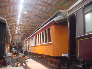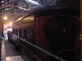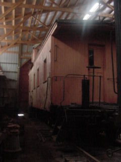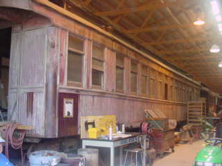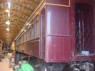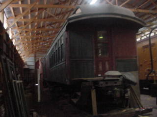 Soo Line first-class coach 920 built by the Harlan and Hallsworth Company in 1893. By 1931, the car was sold to a private individual. It was moved off its trucks and used as a building. It was donated to Mid-Continent in March 1975 and moved to North Freedom.