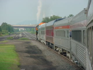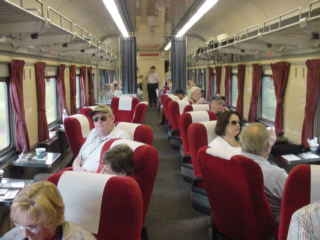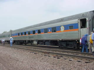 The queue grew much longer before boarding commenced and I chose a seat in the parlour car "Braddock Inn". Our train consisted of Great Northern SD45 400 "Hustle Muscle", Amtrak P42DC 166, lounge car Mount Vernon" 800708, "Kitchi Gammi Club" VRIC7 800705, Southern Pacific coach "Golden Sands" 800748, Southern Pacific coach "Golden State" 800881, Santa Fe lounge "Mojave", parlour car "Braddock Inn" 800854, New York Central parlour car 38 800655, Super Dome 800862 and "Cedar Rapids" 800040.