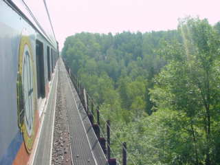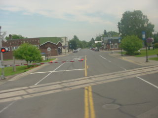 Crossing the Huson trestle near State Line, which was a gauntlet bridge when the line was double-tracked. A gauntlet track is where railroad tracks converge onto a single roadbed and are interlaced to pass through a narrow passage such as a bridge for tunnel. A frog at each end allows the two tracks to overlap, and the four rails run parallel through the passage on the same ties, then separate again at the other end.