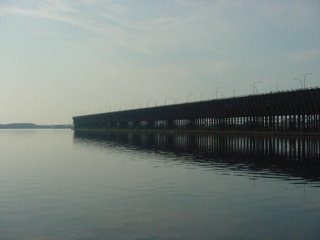 Our crossing of the former Northern Pacific Grassy Point draw bridge, which carries BNSF tracks across St. Louis Bay and into Duluth. It is also used by Canadian Pacific (former SOO LIne) and Union Pacific (former Chicago and North Western) transfer runs. Built in 1912, it is a swing bridge with through plate girder and trestle and is 660 feet long with the largest span being 430 feet.