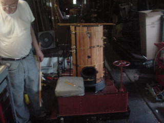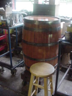 A stand-up boiler and water car made out of a Kentucky whiskey barrel.