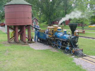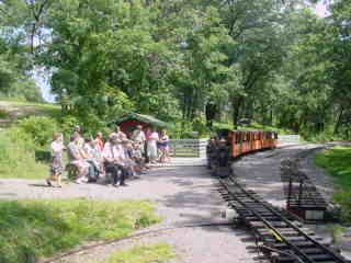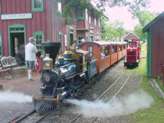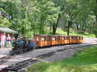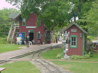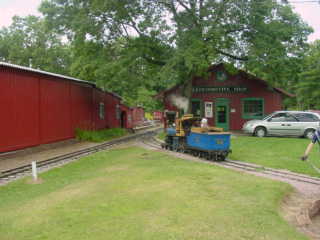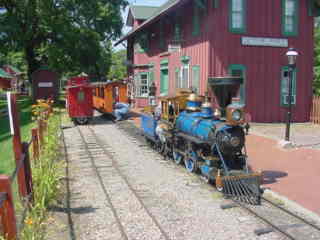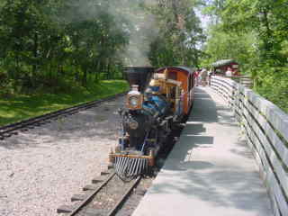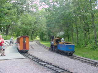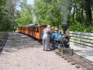 Riveride and Great Northern Railway HistoryThe Riverside & Great Northern Railway started in Janesville, Wisconsin in the late 1940's with Elmer Sandley saying to his son Norman, "If you'll go with me, I'll play ball with you and we'll build a 15-inch-gauge railroad that would be big enough for everyone to enjoy". City administrators approved a ten-year lease on a two-mile right-of-way along the Rock River from Riverside Park to Mercy Hospital. While the Sandleys built locomotives 4001, 128, Tom Thumb, and several passenger coaches in 1947-48, every hobbyist in the neighborhood came out to help lay track. At 11:00 a.m. on June 6, 1949, with four half-block-long lines of people waiting for a ride, Elmer Sandley departed South Park Station in Riverside Park at the throttle of locomotive 128 pulling the first train of fare-paying passengers.