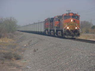 The line of BNSF freights at Belen. From there we continued south on Interstate 25, passing a southbound coal train on the way to Socorro.