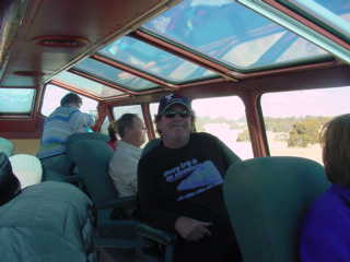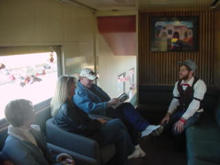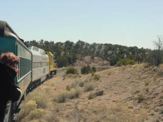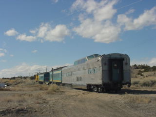 Today's Chief consisted of P42DC's 64 and 6, baggage 1255, transition 39009, sleepers 32086 "Louisiana" and 32090 "Michigan", diner 37003 {a diner light car}, lounge 33027 and coaches 34026 and 34097. I boarded the "Michigan" and had Room 14 with Gwen as my Sleeping Car Attendant, who then told me the bad news. There were no working toilets and no power in the wall outlets in that car. So much for watching Motley Crue on the way to Albuquerque. I recevied a 5:15 PM dinner reservation and relaxed in the room until we reached cold and windy Albuquerque early