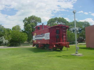 Santa Fe caboose 999140, built by the railroad in 1942 as Santa Fe 2131, is on display along the highway side of the Welcome Center, as is this railroad signal.