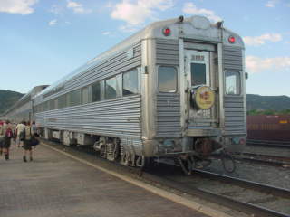 Santa Fe observation car "Vista Canyon", built by Pullman-Standard in 1947. It was built as a round-end observation car, then the round end was squared off in 1956 to allow the car to be used as a mid-train bedroom lounge car for more flexibility. It once ran on the Santa Fe's premier "Super Chief" train between Chicago and Los Angeles and had a lounge area at one end with rear facing windows, and private rooms at the other.