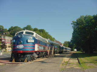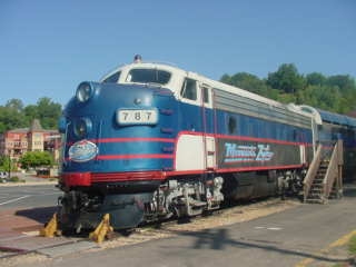 The former Minnesota Zephyr dinner train, with FP7 787, ex. Coe Rail 716, exx. Cadillac and Lake City 716, exxxx. Burlington Northern 9756, exxxx. Burlington Northern 716, nee Spokane, Portland and Seattle 804 built by Electro-Motive Division in 1953. The owner walked up and we talked for about ten minutes about the train, trail and other things. From here I continued north on Minnesota 95 and crossed the St. Croix River into Wisconsin to Osceola.