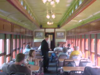 The former Milwaukee Road and Chicago and North Western station in Spooner built in 1902. I picked up my ticket and after everyone else had boarded, I climbed aboard and sat at a table in the "Apostle Isle" then acquired a Coca-Cola from the club car and waited for departure over the former Chicago and North Western tracks.