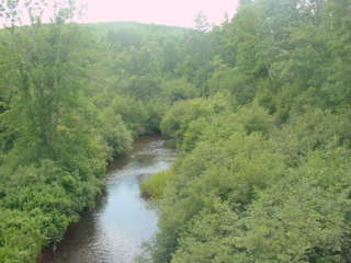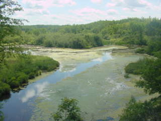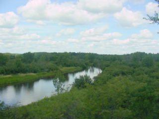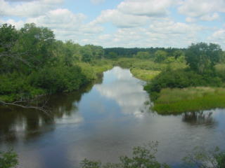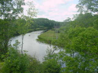 The train crossed the fill that blocks the river from flowing to the other side of the tracks.