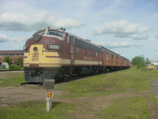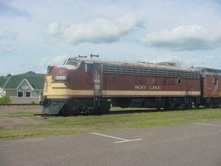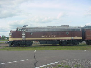Soo Line F7A 500-A, built by Electro-Motive Division in 1949 and nicknamed Sweet 'Soo', was the first passenger diesel on the Minneapolis, St. Paul and Sault Ste. Marie Railway and was a demonstrator then acquired by the Soo Line spring 1950 along with a cabless F7 booster. Numbered 500-A and 500-B, they were repainted in the Soo Line's maroon and gold color scheme. Before 1950, all Soo Line passenger trains were powered by steam locomotives. The 500-A and B were the first Soo Line diesel-electric locomotives in regular passenger service, pulling the "Soo-Dominion" on May 22, 1950. Steam power on the Soo Line ended in 1955.
