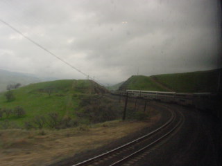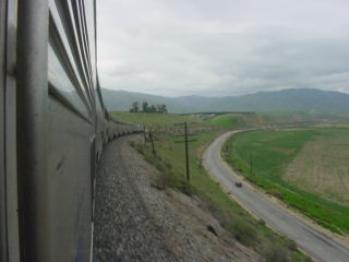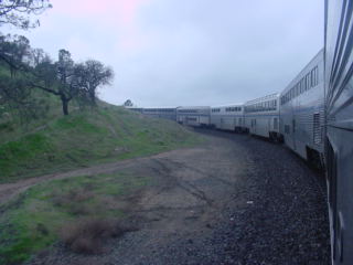 The Coast Starlight waited in front of the Bakersfield station during our crew change and fresh air break. At 2:17 PM, the Coast Starlight departed for our trip around the Tehachapi Loop.