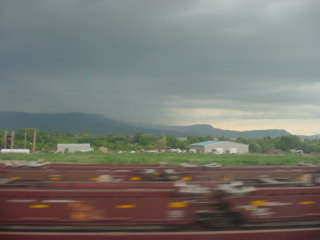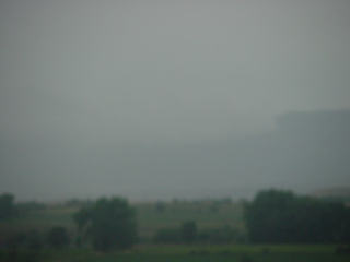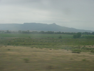 Two interesting mesas south of the train on the way to La Junta. The train was stopped by a flash flood warning about twenty minutes before La Junta then proceeded into the station where we stopped during a driving rainstorm. I managed to access the Internet and cleared out my e-mail before we departed over an hour late into the night, after which I made up my room and called it a night.