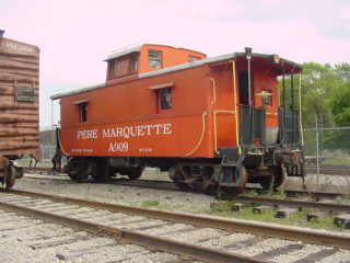 Pere Marquette Railroad caboose A909 built by the Magor Car Company in 1937. Cabooses of this style were used on every freight train hauled by Pere Marquette 1225. In 1950, A909 was relettered to the Chesapeake & Ohio and went on to serve the C&O Railway and Chessie System until its retirement in July 1983, after which it was donated to the Michigan State Trust for Railway Preservation. The "A" stands for accommodation.