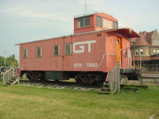 Grand Trunk Western caboose 75003, nee Santa Fe 1647 built by American Car and Foundry in 1928. It was rebuilt twice by the Santa Fe before the Grand Trunk Western purchased it in 1969. Upon delivery, it was re-numbered to 75003 to match the local standard. This caboose was used around the Durand area until 1988, when it was sent to Port Huron's yard and retired in August 1989. Shortly thereafter, it was purchased by Jim and Laurie Kapp and donated to Durand Union Station.