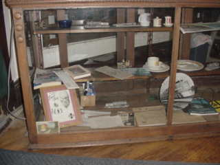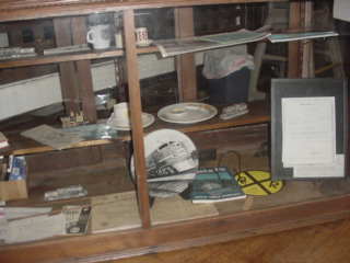 There are displays cases housing railroad memorabilia, including a Wabash Moberly Division employee timetable.