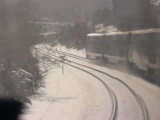 The Southwest Chief at rest. We departed on time and continued west out into the storm as I wrote the story. My room's windows were horrible so few if any pictures would be taken from the room. The train stopped in Trinidad with about two inches of snow on the ground before it climbed Raton Pass and I started to watch Asia's "Fantasia".