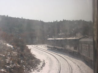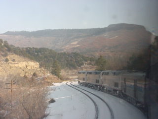 12/06/2009 Dark and gloomy was the morning as I arose after Garden City and went to the dining car for breakfast, seated with a lady and a gentleman who had ridden all the Amtrak routes except the Michigan Services and Oklahoma trains. I had French Toast and sausage patties before returning to my room working on this story and it was snowing lightly when we arrived early in La Junta.