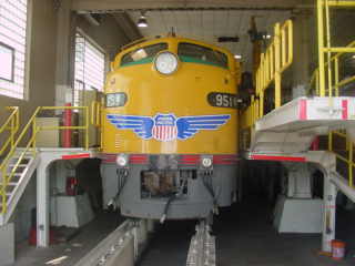 Union Pacific E9A 949 built by Electro-Motive Division in 1955. It was one of the last of sixty-nine E9s bought for the railroad's streamliner and domeliner passenger trains, including the City of Los Angeles, City of Portland, City of San Francisco, City of St. Louis and Challenger. In 1972, it became Chicago and North Western 511 then became Metra 511 from 1984 to 1989. It was then sold to Kasten Railcar Services of Edwardville, Illinois in late 1989, who sold it to Union Pacific in September 1990. They returned the unit to its original Union Pacific number and operates the unit as part of an A-B-A set of E-units on special trains.