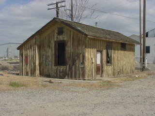 The former Edison Southern Pacific freight house appeared to be just a shack until one looks closer. Edison was a joint Southern Pacific-Santa Fe agency and originally maintained a full time agent. Outbound traffic consisted of potatoes (May-July), grapes (July-December), citrus fruit (October-March) and wine. As traffic dwindled the agency became seasonal only; primarily to serve the potato rush. Edison was originally known as Wade. A siding was established there around 1884-1885.