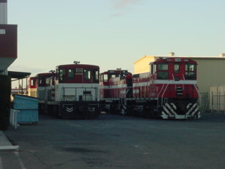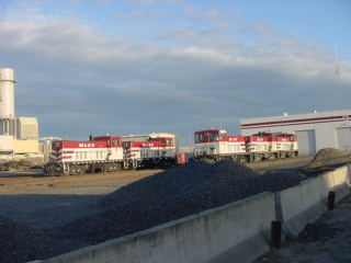 Modesto & Empire Traction 70 ton switcher 600 built by General Electric in 1947, SW1500 1500 (ex. Vancouver Wharves 821:2, nee St. Louis-Southwestern 2491 built by Electro-Motive Division in 1968) and 1501 (ex. Vancouver Wharves 823, nee St. Louis-Southwestern 2489 built by Electro-Motive Division in 1968.