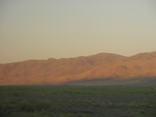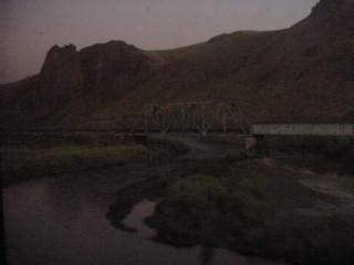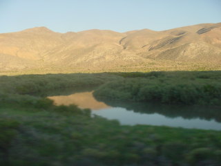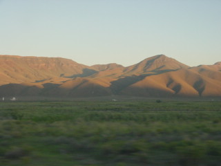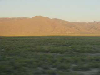 Mountains east of Sparks. I watched the bonus DVD of Wayne Gretzky but had to stop it as I had a 5:30 PM dinner reservation as we sped. I had the Braised Flat Iron Bordelaise and ice cream with two gentlemen, one from San Francisco and the other from Denver. Back in the room, I finished the Gretzky DVD and at Winnemucca, another crew change and fresh air stop was made. My next DVD was ABBA "In Concert".