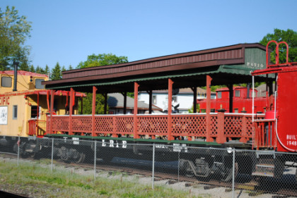 Erie Railroad flat car 8200 built in 1904. It was used for years at the Cooper Bessemer plant in Grove City. This fish-belly center-sill flat hauled diesel engines and was donated by Cooper Bessemer, restored by Trinity Industries and placed here in 1999, then converted to patio car 5300.