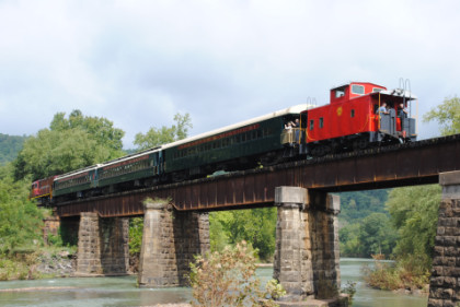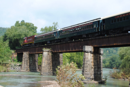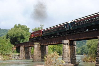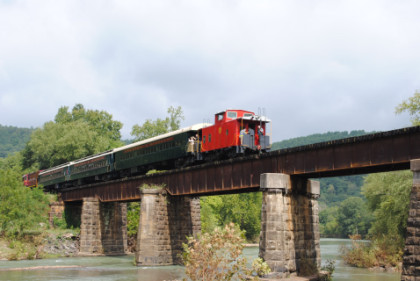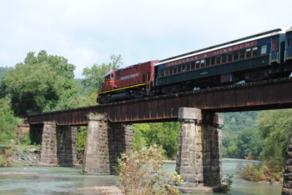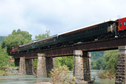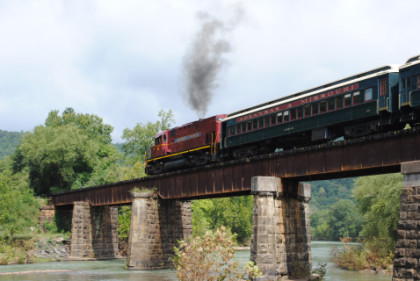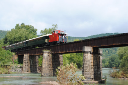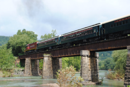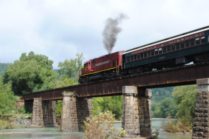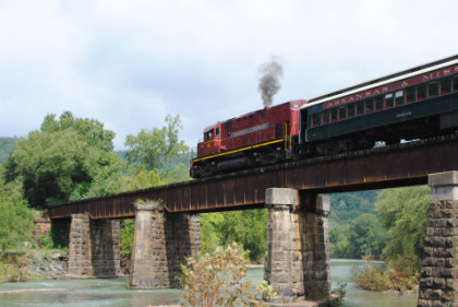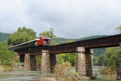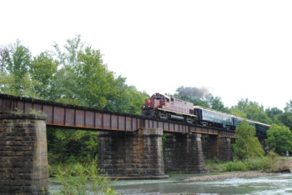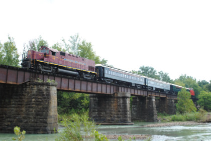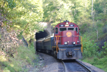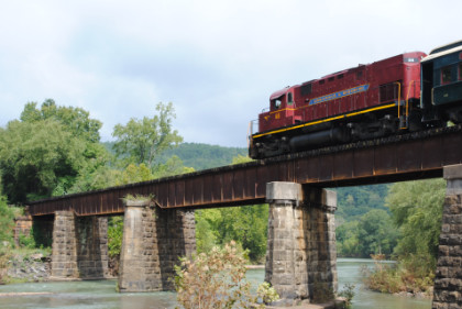 The train ran by the Fayetteville station then passed the airport and Air Museum before we left that town. Our route started to follow the West Fork of the White River and we passed a road with the bridge at the end before going through Winslow. We were then on the approach to the Winslow Tunnel, a 1,702 foot bore at an elevation of 1,735 feet, the highest mountain rail crossing between the Rocky Mountains and the Appalachian Mountains. After exiting the south portal, we stopped for a set of static photos done in steps.