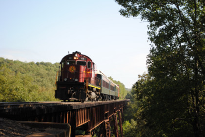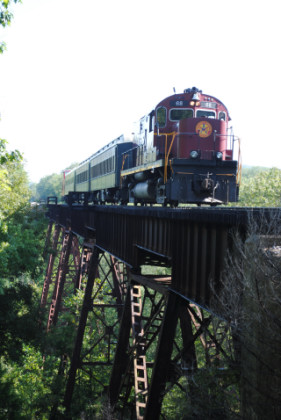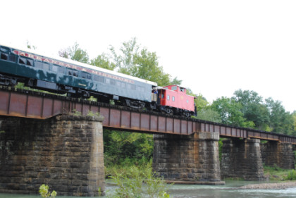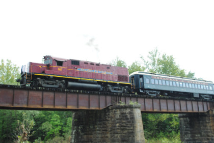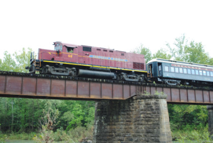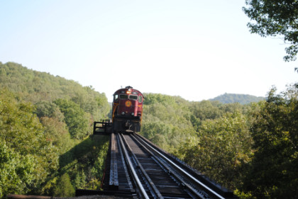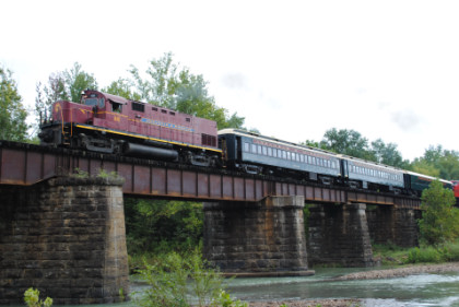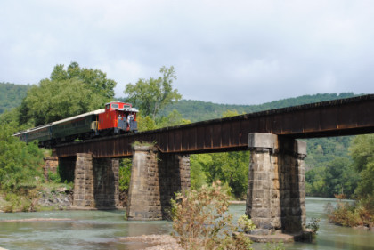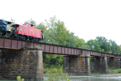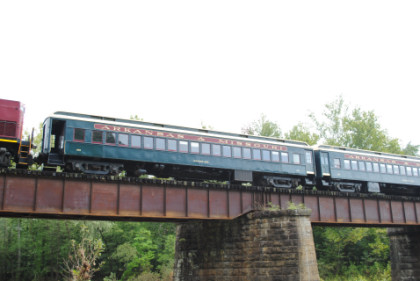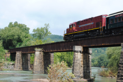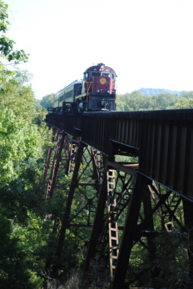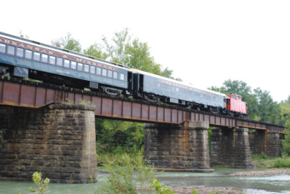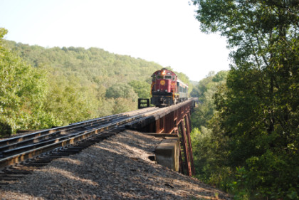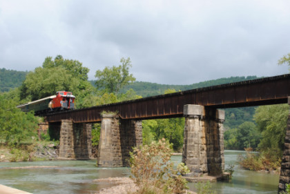 Static photograph location five at Trestle 1. When that was completed, we reboarded again and continued south, taking a few more curves before crossing the 421 foot long and 110 foot high Trestle 2. A few minutes later, our train crossed Trestle 3, which is 451 long and 110 feet high. We were then following Clear Creek and slowed for a section of track that had been repaired from flooding two days ago. After passing a waterfall under our first crossing of Interstate 540, we rolled down a 3.4 mile stretch of straight track and went through Chester, where an Arkansas and Missouri ballast train was in the siding waiting to go back to work with the flood repairs along our route.