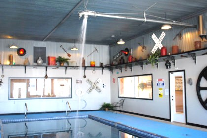 A steam train is in the wall between the lobby and pool.