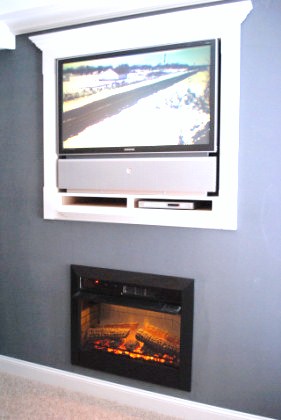 In wall big screen television with fireplace below. The room also has a heater/air conditioning unit.