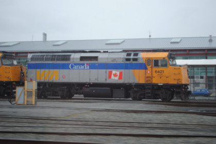 VIA F40PH-2 6421 waits for its next trip. The Cascades arrived at Vancouver and we were let off car-by-car to go through Canadian Customs. I was asked the most questions I had ever been asked by Customs. Elizabeth took a little longer but soon was reunited with Bob and we all walked out to his car.