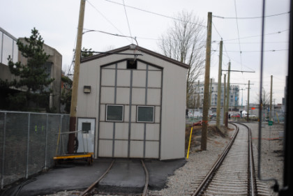 Passing the streetcar barn of the Downtown Historica Railway, which operated on this trackage from 1998 to 2011.