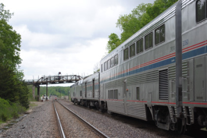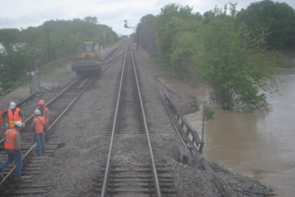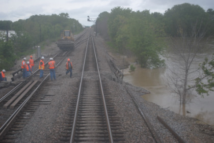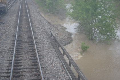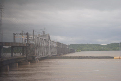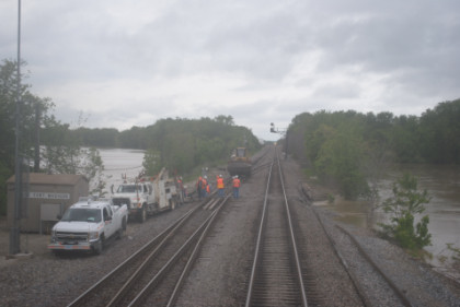 Back in the sleeping car, I showed Hak the Chris Guenzler Million Mile Lookout Point and then Santa Fe Lake then worked on the beginnings of the July Orange County Railway Historical Society show as the train made its way to Iowa and our next fresh air stop at Fort Madison. Well, that did not happen as planned. We stopped at Argyle due to water over the rails to the west of Fort Madison. All rail traffic was stopped and later it was announced that we would be moving by 2:00 PM. We had sat down to lunch with a very nice young lady who does film editing, going to New York and a lady going to Chicago. I had the Angus Beef Burger and vanilla ice cream. About 1:00 PM, they opened the forward sleeping car door for a fresh air break.