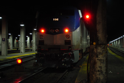Southwest Chief 4 5/11/2010The Southwest Chief reversed in at 6:10 PM and had a consist of P42DCs 188 and 185, baggage 1237, transition 39014, sleepers 32060 and 32075 "Connecticut", diner 38027, lounge 33027 with coaches 34032, 31007 and 34082. My Sleeping Car Attendant was Hak To Hung. I accessed the Internet, piggybacking off the signal from my 583 Pacific Business Class Car on next track over until it left for the yard. The train departed LAUPT on time at the new departure time of 6:55 PM and proceeded to Fullerton, our first stop on the way to Chicago