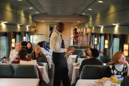 5/12/2010I woke up west of Winslow before James and I went to the dining car for breakfast. We were seated with a couple from Hemet going to Chicago before driving to very southern Illinois to see the wife's sister. I enjoyed French Toast and bacon this morning then after I freshened up, read USA Today before watching my DVDs of Milwaukee Road 261 by Richard Tubbesing just before Gallup. Our car got the nick name of Siberia because the air conditioning vents in the rooms could not be closed.
