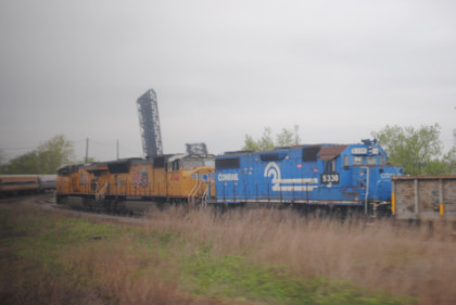 Our train curving by a train with Union Pacific and former Conrail power as the train headed for the Buffalo-Depew station.