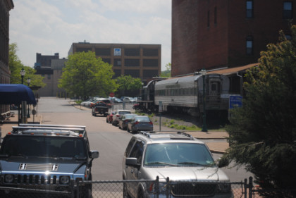 The historic Erie Canal. Randy and I had a noon lunch reservation so we went to the dining car when we were called and were seated with a gentleman from New Jersey. I enjoyed the Angus Beef Burger and chocolate ice cream. After hearing horror stories about dining car crews on the Lake Shore Limited, this crew is by far the best that I have ever had aboard this train. There was an extended stop at Syracuse then the train reversed out of the station west to the next crossover.