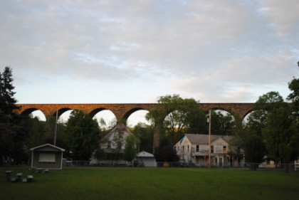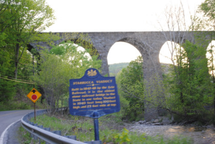 The Starrucca Viaduct, a stone arch bridge that spans Starrucca Creek. Completed in 1848 at a cost of $320,000, it was at the time the world's largest stone railway viaduct and was thought to be the most expensive railway bridge as well. Still in use, the viaduct is listed on the National Register of Historic Places and is designated as a National Historic Civil Engineering Landmark.