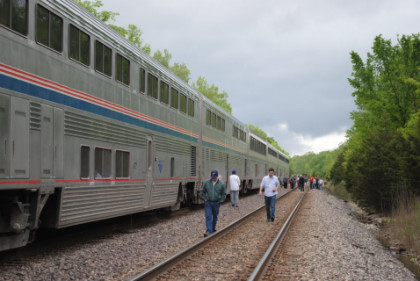 5/13/2010I arose on a dark rainy morning at the BNSF Argentine fueling pads and enjoyed my Big Texas Cinnamon Roll and orange juice on the way to Kansas City Union Station, where I stepped off for a few minutes into a wet world. During the night, we lost time due to trees along the tracks being blown down by tornados, so we departed Kansas City at 8:27 AM {7:35 AM}, a little late. I put on my CD of Metallica "Master of Puppets" as we made our way to the crossing of the Missouri River at Sibley. The next CD this morning was "The Very Best of Mick Jaggar" as we rolled on the way towards La Plata and I finally spotted the old Wabash Railroad grade that ran once to St. Joseph before we reached Marceline. There were plenty of slow orders our along our route this morning. The next CD Deep Purple "Slaves and Masters" which took me past La Plata and it felt very odd to be getting off in La Plata and going to the Depot Inn & Suites. Instead, I would be waving at La Plata this morning from the train. However, I did step off there and talk to Bob Cox for a few minutes.