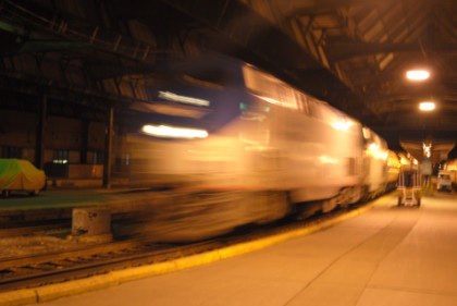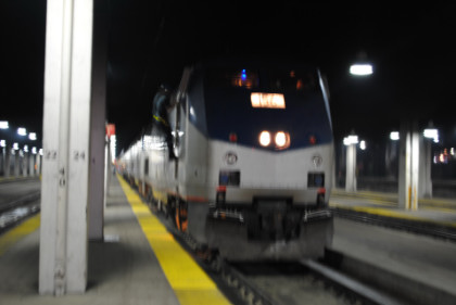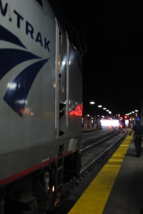 I boarded the second Amfleet car, turned on the laptop and worked all the way to Pittsburgh, where I went into the station, found an electrical plug and continued to work on the story. Soon I was joined by another mileage rider friend and after doing as much as I could, we went up into the cool nighttime air to wait for our train to Chicago.