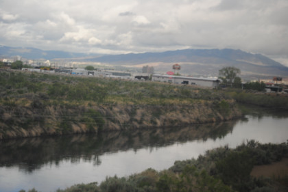 The Truckee River which we followed into Sparks and Reno, our next fresh air break. The train stopped at Vista, just before Sparks and I managed to get online during this delay. We passed the Union Pacific Sparks Yard before entering the Reno Trench to the Reno station and I took fresh air on a very cool morning while it was trying to rain. We departed at 9:30 AM {8:36 AM} and proceeded to Truckee as I read USA Today.