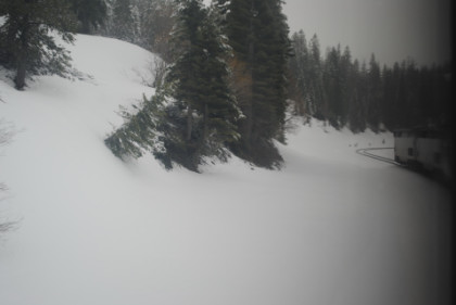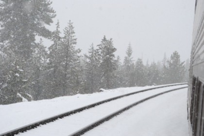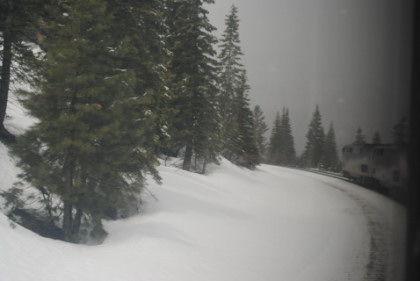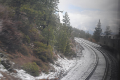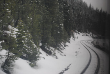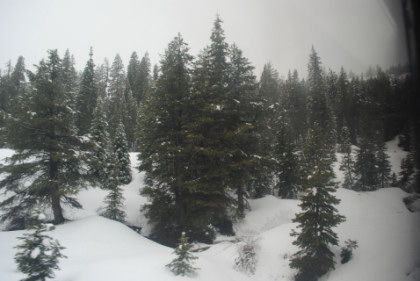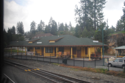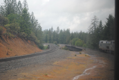 The ski area at Soda Springs. The train dropped downgrade and by Shed 10, the snow had turned to rain. We then dropped through Yuba Gap, also known as Yuba Pass, and Emigrant Gap as we descended the western slope of the Sierra Nevada on a very wet day.