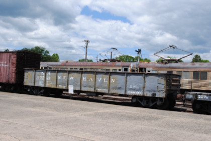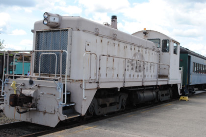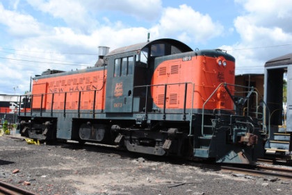 Electric Boat Company 44 ton switcher "Carol", nee New York, New Haven and Hartford 0814 built by General Electric in 1945. It is equipped with extended swivel couplers which allowed for operation on the former trolley tracks in New Haven and on the Seaview Avenue line in Bridgeport, both of which were also owned by the New Haven Railroad. The railroad sold the locomotive to Electric Boat in 1959 and they used it on their private trackage till 2005, after which they donated it to the museum in 2006.