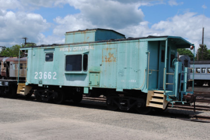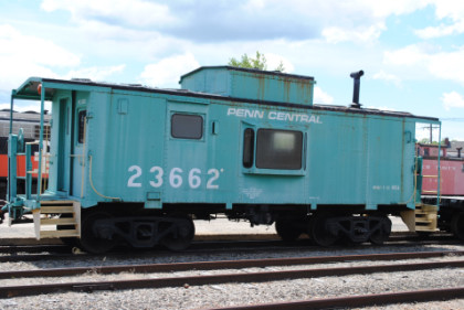 Penn Central caboose 23662, ex. Conrail 23662, exx. Penn Central 23662, nee New York, New Haven and Hartford C-687 built by International Car Company in 1948. This car was originally a class NE-6 and was rebuilt circa 1970 to a class N-8A by Penn Central. The windows in the cupola were sealed, a water tank was suspended from the ceiling, and bay windows were added under the cupola. It was donated by United Railroad Historical Society of New Jersey in 1997.