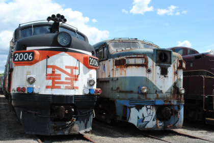 Electro-Motive Division and American Locomotive Company engines share this scene.