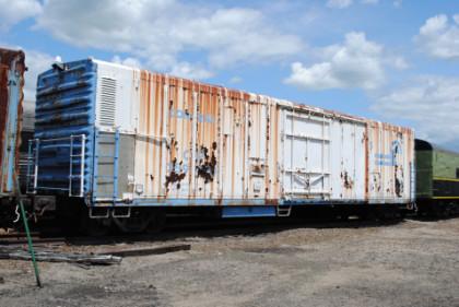 Conrail mechanical reefer 359020, ex. Conrail 359020, nee Erie-Lackawanna 5019 built by Pacific Car and Foundry in 1966 and donated by the Conrail Technical Society in 2000. This unit is a steel-sheathed, mechanical refrigerator car with a cushioned underframe. 5019, like others of its kind, most likely hauled fresh produce or meat. Mechanical reefers started into service in the 1950's, replacing the rolling iceboxes that preceded them. Car 5019 was also fitted with a GPS transponder for testing by Conrail, the first-ever use of GPS on a freight car. The transponder remains attached to the car.